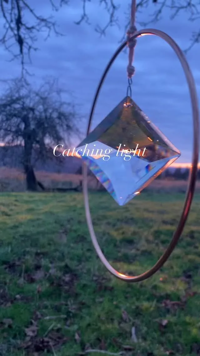 “If we want to travel the cosmos, we can start by looking inside ourselves. These spirit tools I create serve as hanging altars to the elements of the earth. They capture the essence of the cosmos within by sharing the unseen refractions in ephemeral moments through shattered light. There is also an infinite unknown within each facet of our soul. I have found it meaningful to create sacred objects as reminders of my connection to the vast universe, to create altars to the earth and all the wisdom carried in this vast ecosystem.”